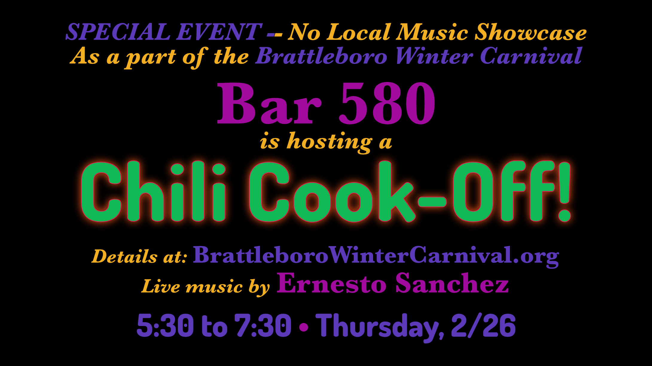 Bar 580 580 Canal Street, BRATTLEBORO, VT, United StatesBut there WILL be music!!! As part of the Brattleboro Winter Carnival, Bar 580 is hosting a Chili Cook-Off, from 5:30 to 7:30pm, with live music by Ernesto Sanchez. There…